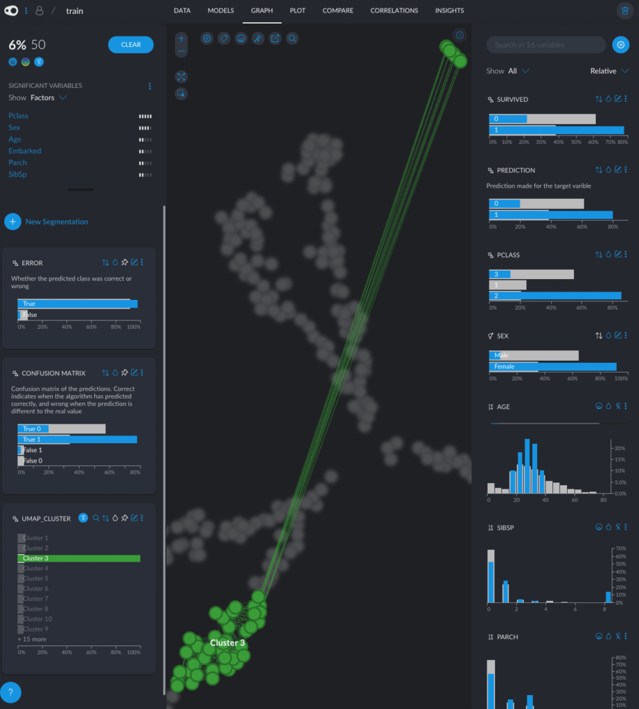 Or, for example this Cluster 3 “Female passengers in 2nd and 3rd class”, 80% of whom were able to survive. Note how the UI helps telling the story. In the upper left corner we have the “significant variables” telling us that passenger class and sex are significant vars in this cluster. Down left we also have the Error bars and the Confusion Matrix. Then, on the right, we have a comparison of the predicted variable and the actual prediction (upper right). Below we see other variables.