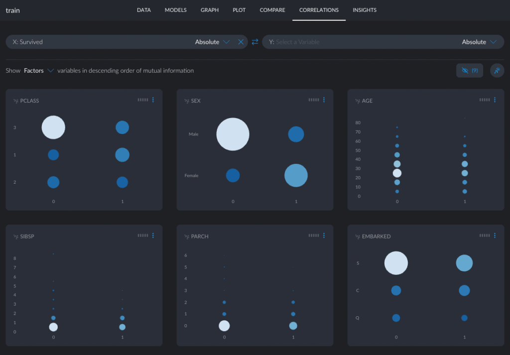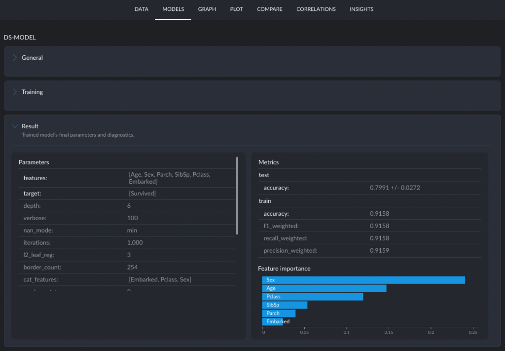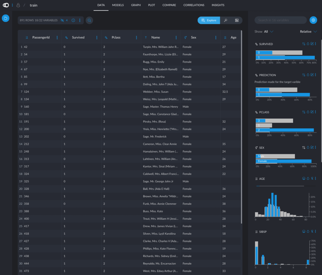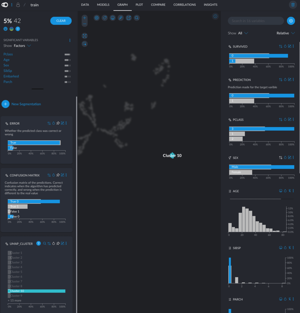 At the start of my evaluation I wanted to see if it were possible to get a feeling for the data without writing any pandas code and using Jupyter, and then set up a predictive model for Survived using UI tools only. The tool largely worked for me, and after ~1.5 hours I felt like I discovered some non-obvious pattern in the dataset. For example, “Male passengers in the 3rd class and no siblings” were unfortunately not very lucky that day. Take a look at Cluster 10 and the side bars.