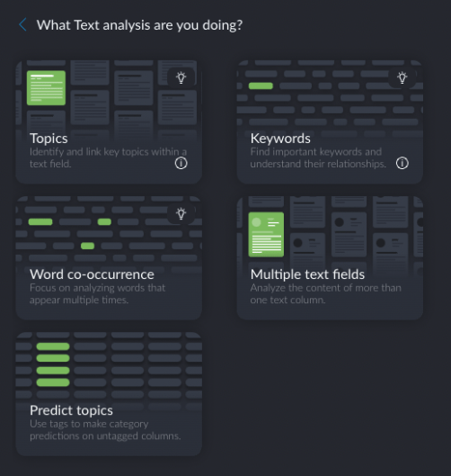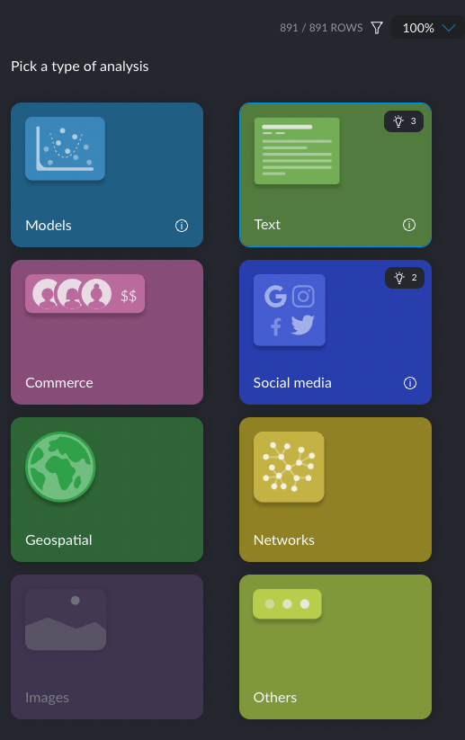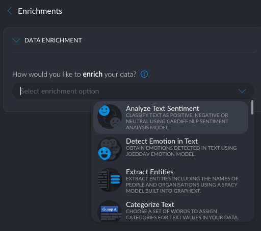 The available enrichment types include sentiment analysis, entity extraction, fuzzy grouping, geolocation, and some external methods that require an API key. Btw, the origins of Graphext were in text analytics, hence all these text analysis options (me likey).