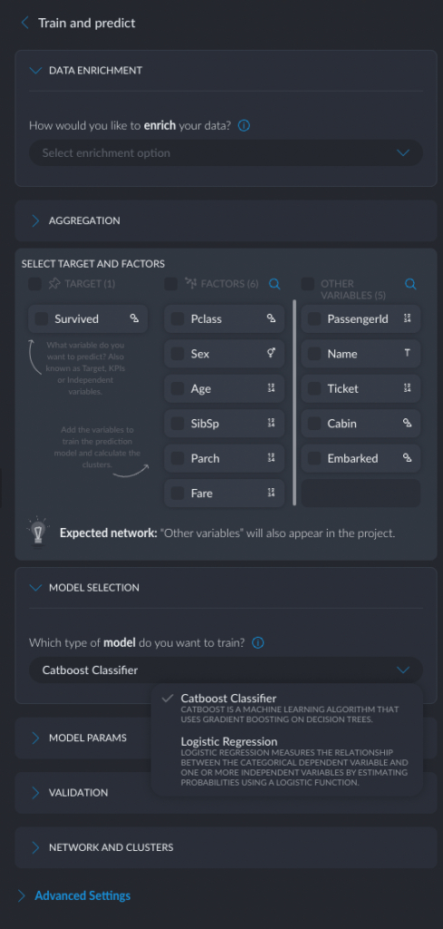 Interestingly, the tool only offered two types of models: Catboost and Logistic Regression (was it because my predicted variable was Categorical?).