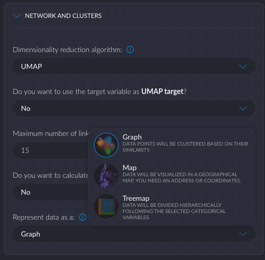 Training the model took about 5 minutes. Graphext has an interesting architecture. The do the “fast tasks” (render graphs, data transformations etc) in the browser and the “slow tasks” (like model training) in the cloud. The browser takes on quite a bit of tasks, much more than in a traditional BI tool architecture. They even have a data engine in the browser called Durro that is able to render 10 million records as a graph. Durro is based on WebAssembly (aka WASM).