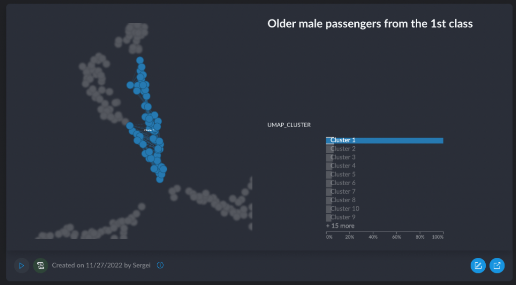Graphext recognized that the end goal of every analysis (unless you are just grokking the data) is a report that goes to the product, marketers, execs, finance, etc. They’ve added the ability to annotate interesting findings, save them as “insights” and then product a report that is basically a collection of slides showing each individual insight. Here is, for example, one of these sliderized insights – “Older male passengers from the first class had a pretty decent chance of survival”.