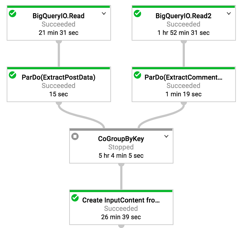 Here is the high-level design of the Dataflow pipeline that we used to bring both the GDELT and Reddit data over to BigQuery.