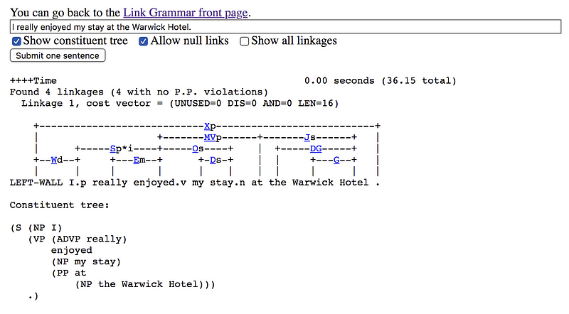 I needed to visualize a sentence parse tree of the “constituent” variety (you know, one of those with S, NP, VP and all the goods) and googled “show constituent trees”, expecting to see good quality hits on search result page 1. Turns out, there are no good quality web tools out there. Sure, there are sites that will offer you to download “applications that run on any version of Vista”, but my Vista desktop was temporarily unavailable that day. Google’s Cloud NLP front page offers a nifty tool to parse and display trees, but those are of the “dependency” variety.