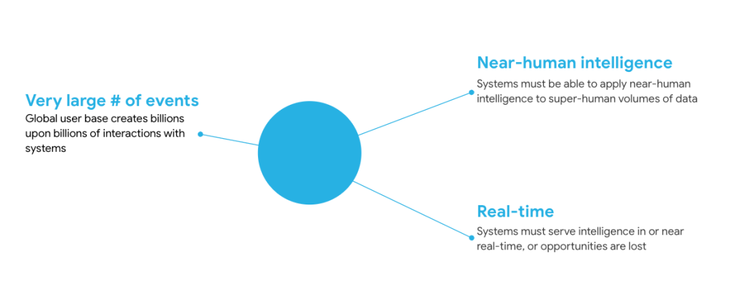 Let’s start with the easy part. It is clear that to address the need for near-human intelligence one needs to use Machine Learning. Dealing with billions of events manually, with heuristics, just would not scale.