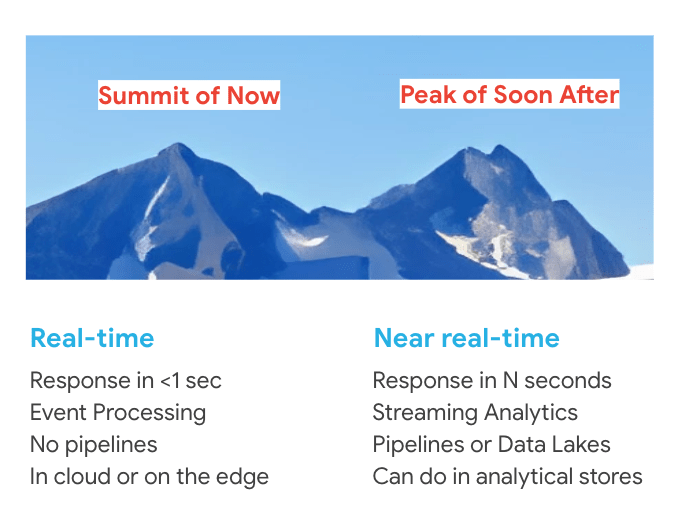 Near Real-time: However, in a large class of use cases users have between several seconds to several minutes to act. For example, I know at least one Security Alarm vendor that does not react to every signal from a movement and glass-breaking sensor, or to a video camera reporting a movement. They wait multiple seconds, collecting all the signals from various rooms of the house, and then make an inference about an incident being a real case of break-and-entry or a false positive. There is a real cost to their business if they react to every false positive, and driving down the rate of false alarms keeps their costs in line. In cases like this, one can start using techniques customary to the domain of Streaming Analytics (time windows and such). One can bring different event data sources, one can even query historical data (or use it as a predictor). Using streaming pipelines or dumping raw events into Data Lakes and then doing aggregations and inference are all fine techniques here. If you feed these events into an analytical store, you even get an early start for forming your next peak in the data value mountain range – the Mountain of Wisdom!